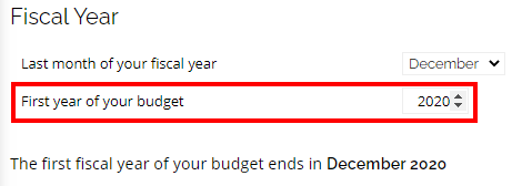 4- This choice determines the first fiscal year of your budgets. For example, if you choose December as the last month of your fiscal year, and 2021 as the first year of your budget, your first fiscal year of your budget will be January to December 2021 in the application.